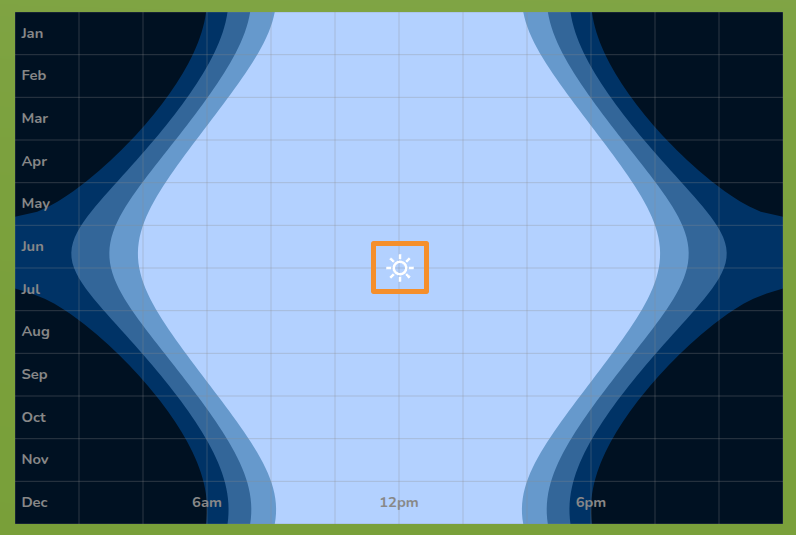 If you click the pause icon, this diagram will appear in the bottom left. Drag the sun across the dates and times to see the shading at specific times.