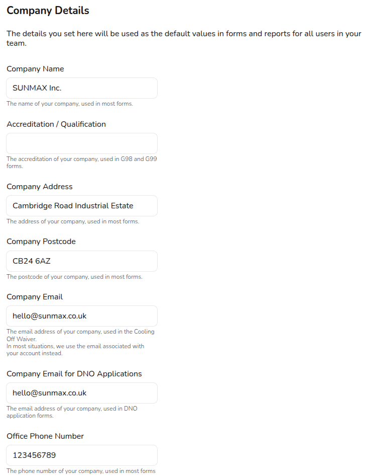The details you set under Company Details will be used throughout Easy PV tasks, forms, and reports.