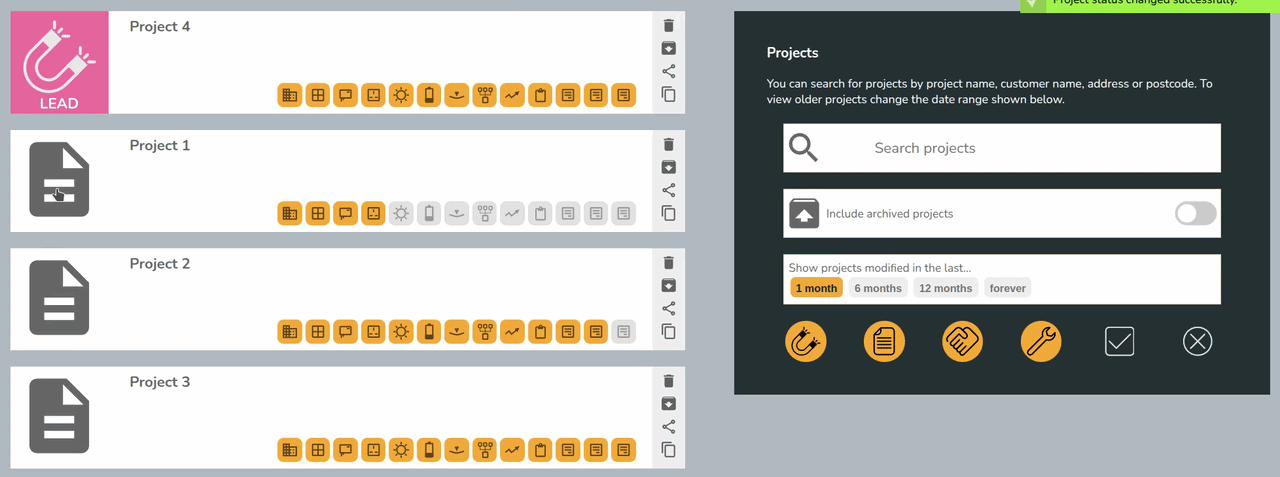From the project overview, you'll now be able to set the status on your project. Use filters on the right-hand side to view jobs in each stage.
