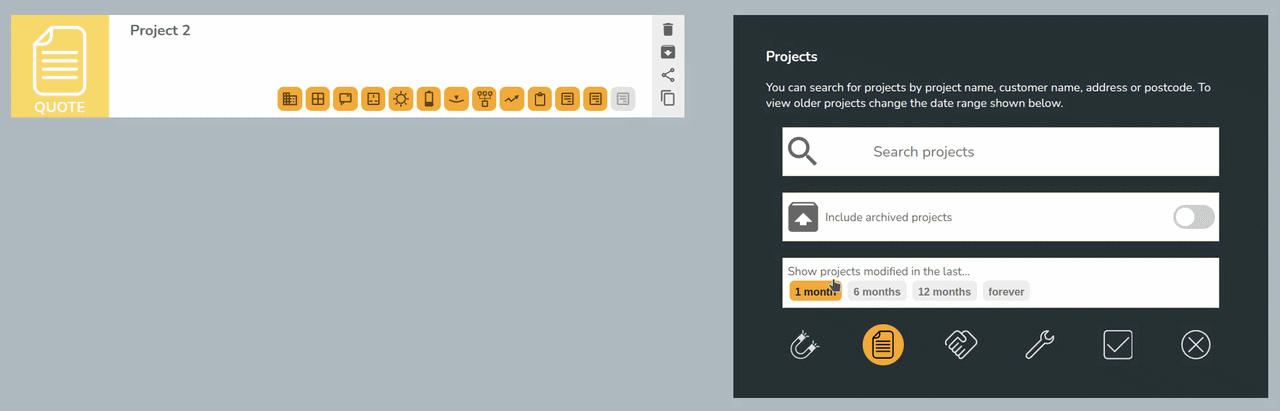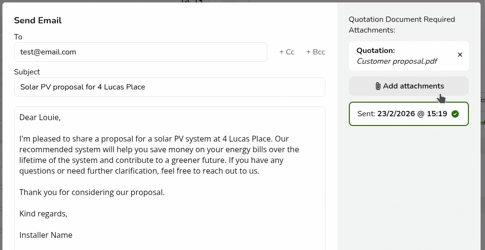 Any files uploaded to the documents tab will be accessible to any user in the team when sending emails through Easy PV. Upload your terms and conditions, MCS certificate or anything else you would like available for all projects.