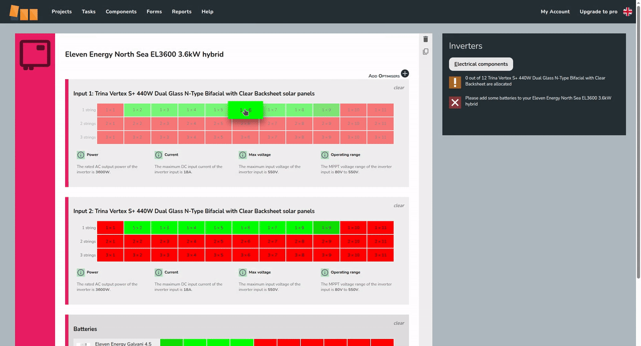 The number of inputs available will vary depending on the size of the inverter, as will the number of strings on each input.inverter. For each input, some options will show in red and others in green. When selecting a stringing option, electrical compatibility information will display below. Here you can see which limiting factor for that input is or isn't satisfied with the selected arrangement.