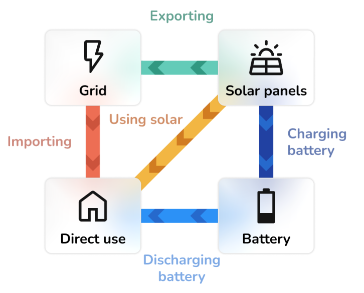 - It shows how much energy is expected to be supplied directly from the solar array, via the battery or imported from the grid.
