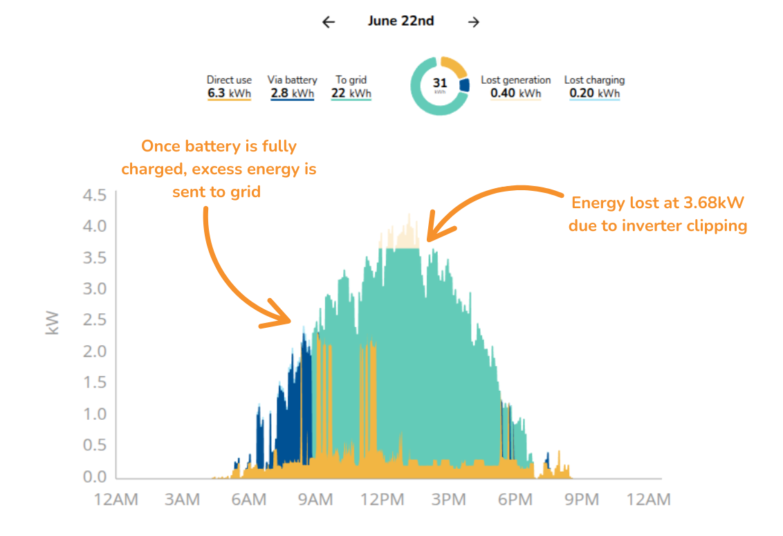 - It will also display the amount of energy lost through inverter clipping, export clipping and charging if applicable.