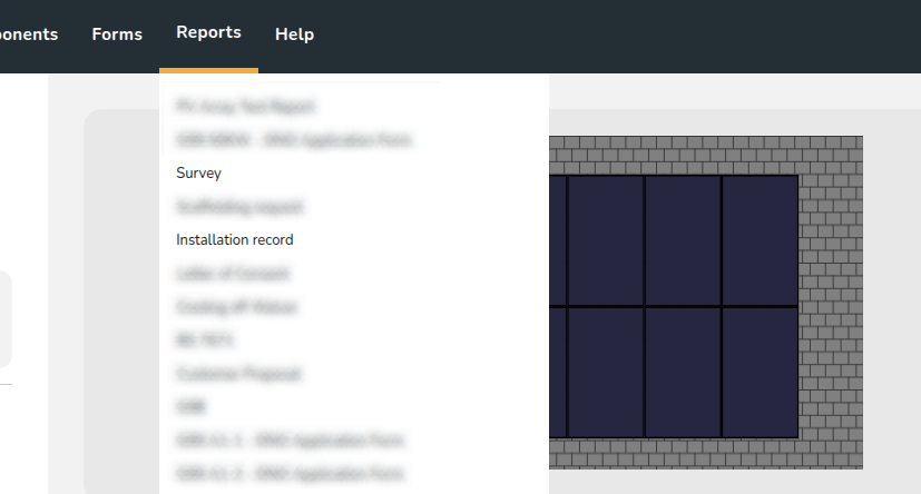 In both forms you can upload images and apply image annotations. A PDF report of the survey and installation record can be generated from the reports drop-down in the main navigation.