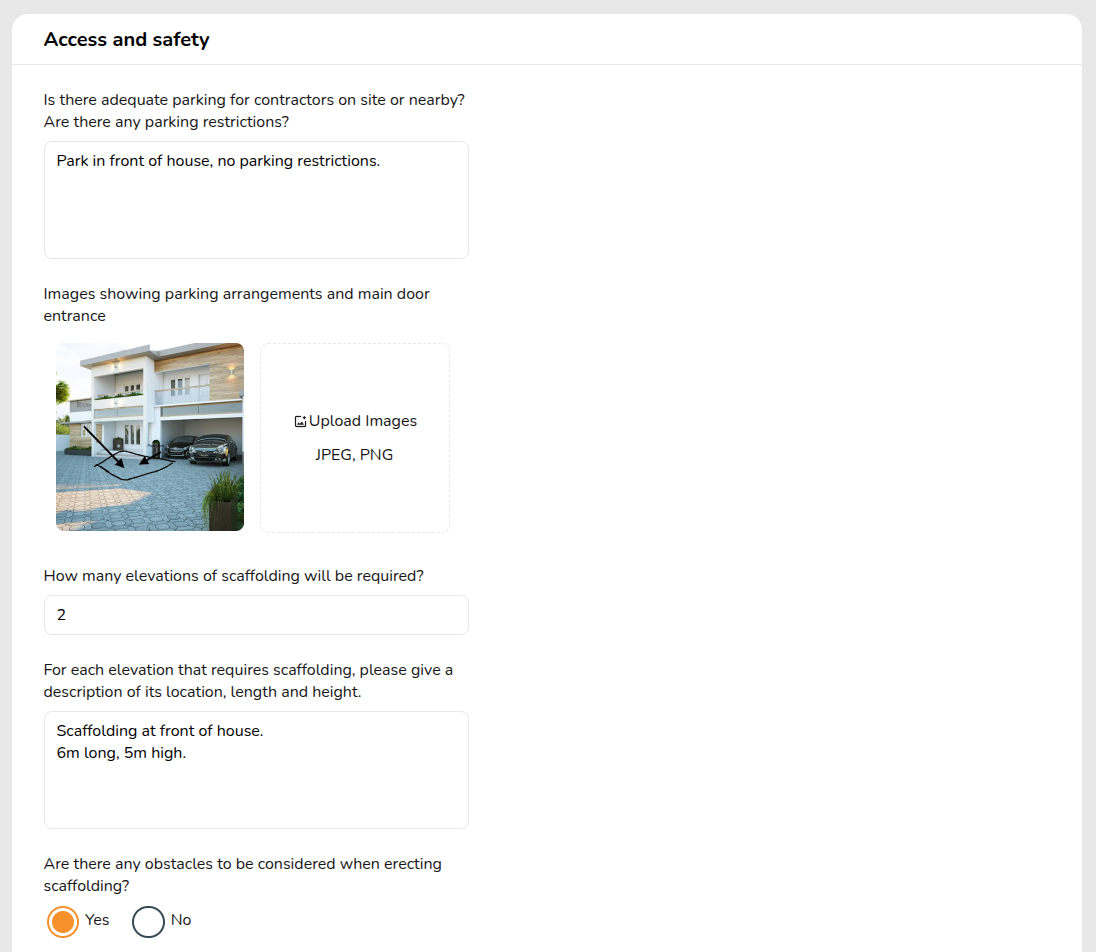 The survey task allows the surveyor to enter all information required to plan out the installation in one location. Surveyors can answer the questions and add additional comments. Information is pulled through from the survey to a scaffolding request form which you can also access from the Forms drop-down.